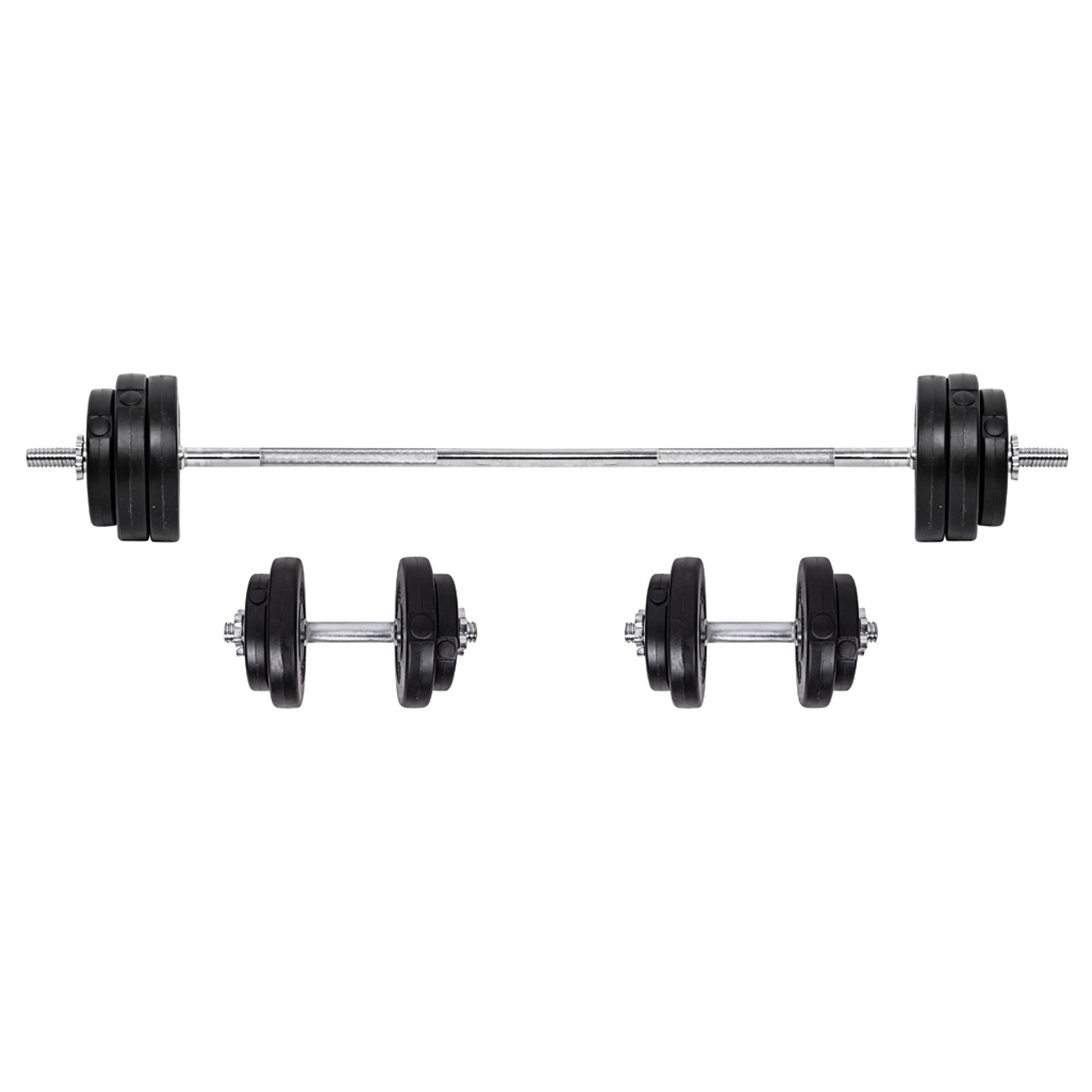 The set includes adjustable dumbbell bars with secure collars, a barbell connector, and a variety of weight plates to support progressive overload and total-body conditioning.